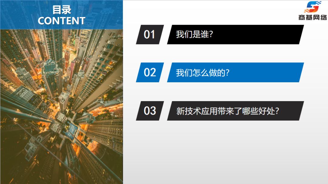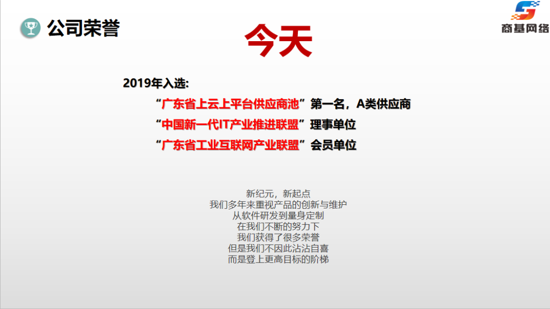 商基网络是一家专门服务中小企业信息化的公司,中小企业更需要通过技术的手段进行转型升级,下面我将从三个方面跟大家报告:第一部分我们是谁,第二部分我们怎么做,和第三部分新技术带来了哪些好处。