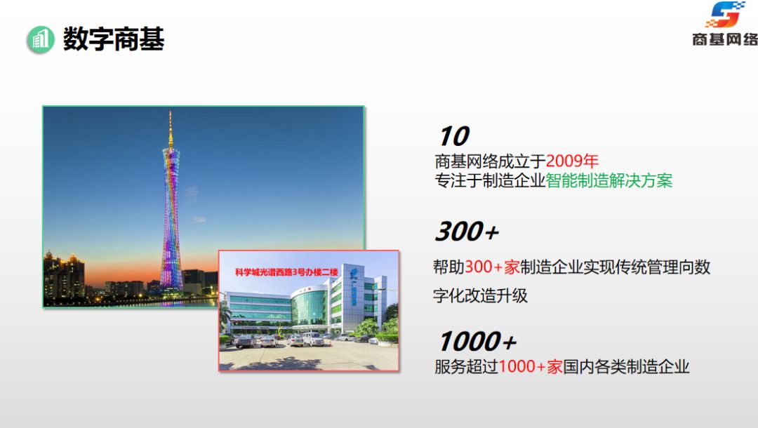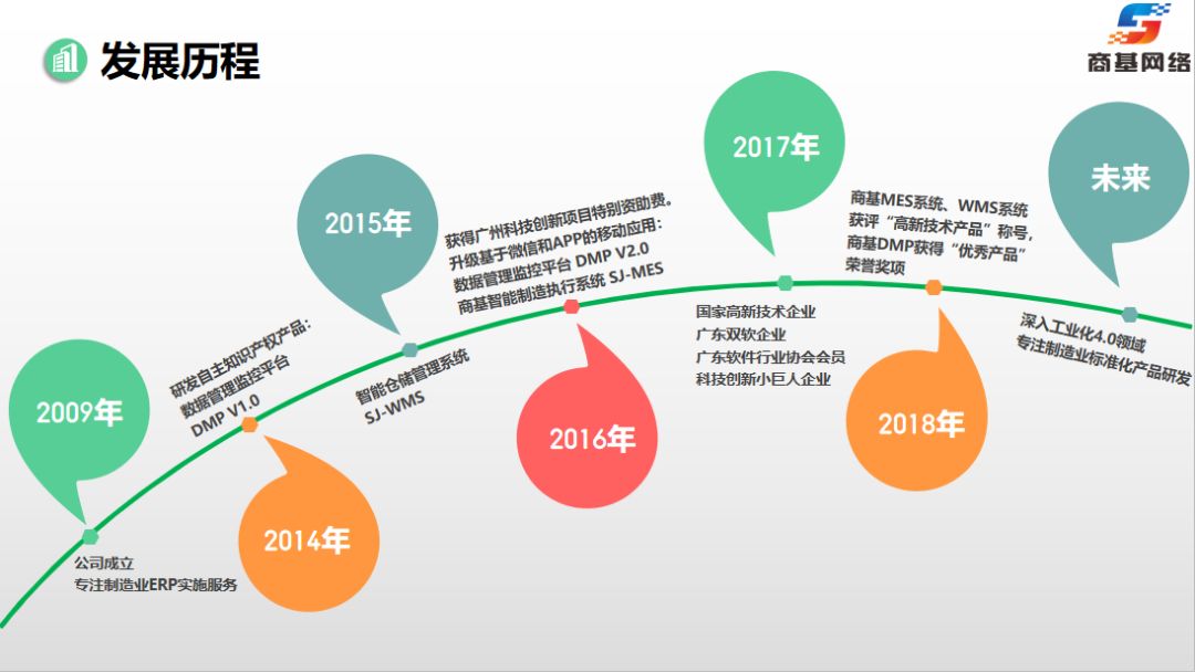 我也跟大家分享一下我们的发展历程:商基网络是2009年成立,我本人从1997年做信息化,从那时候还没有ERP,我自己从业20多年,公司2009年成立目前十年的时间,最早做ERP,现在是做转型智能制造的MES系统。