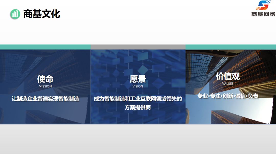 简单介绍一下商基网络,商基网络使命是“让制造企业普遍实现智能制造”,我们的服务对象更多是中小型企业,大型的央企和国企他们是有能力做好这件事情的,国家对他们也特别关注中小企业没有被关注或者是关注比较少,或者需要利用政策做到转型升级更多的是中小企业。