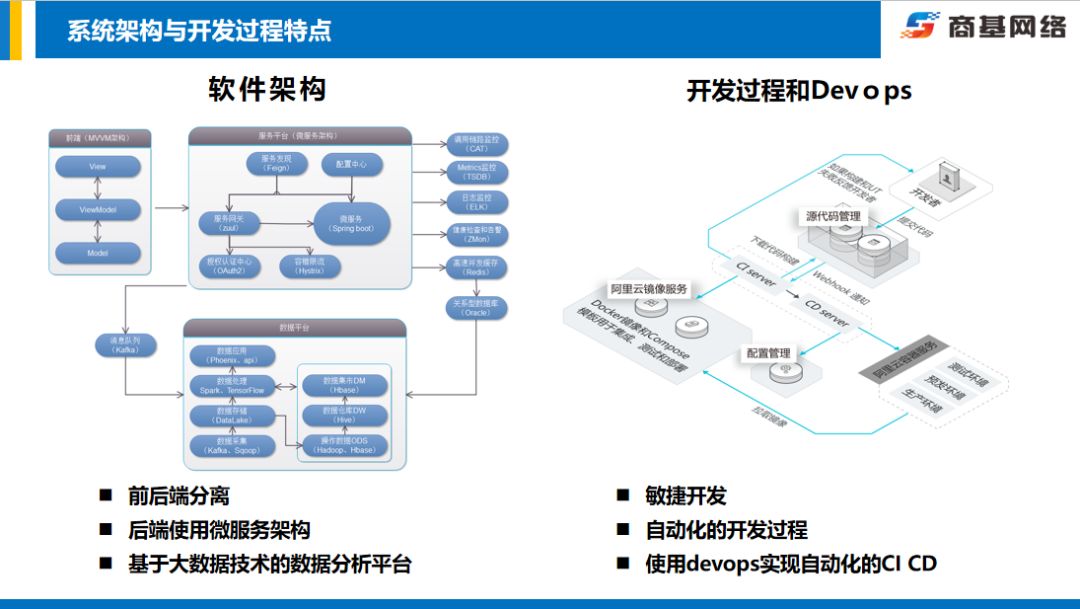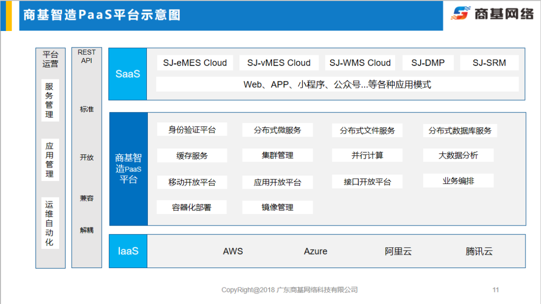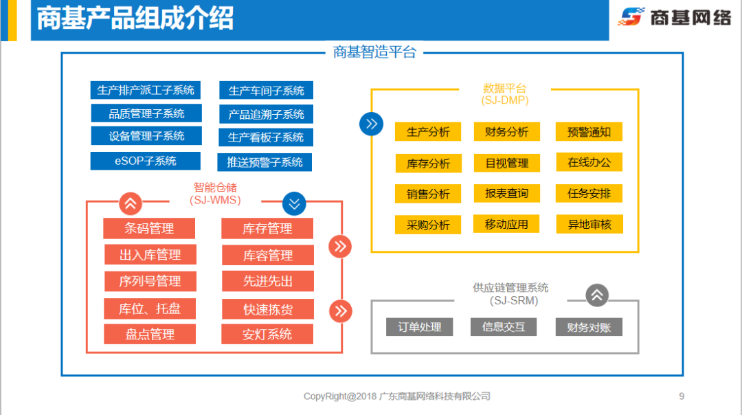 这是我们产品的框架,里面包括商基智造云平台。我们的主题是互联网新技术,后台是用同一个技术搭建的平台叫商基智造平台。