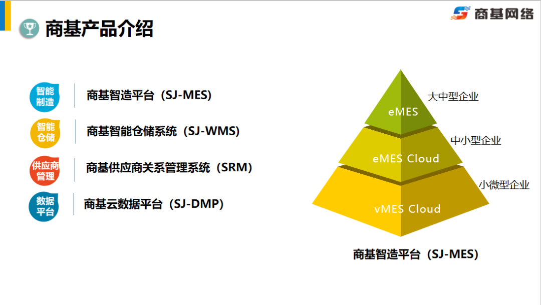 我们商基网络在十年的时间里边做了四类产品,第一个是我们的智能制造的平台MES系统,第二个是智能仓储WMS系统,第三供应商关系管理SRM系统,第四是云数据平台MES智造平台又分为三个具体产品,其中SJ-vMES Cloud是针对小微企业透明车间和产品可追溯的SaaS产品。