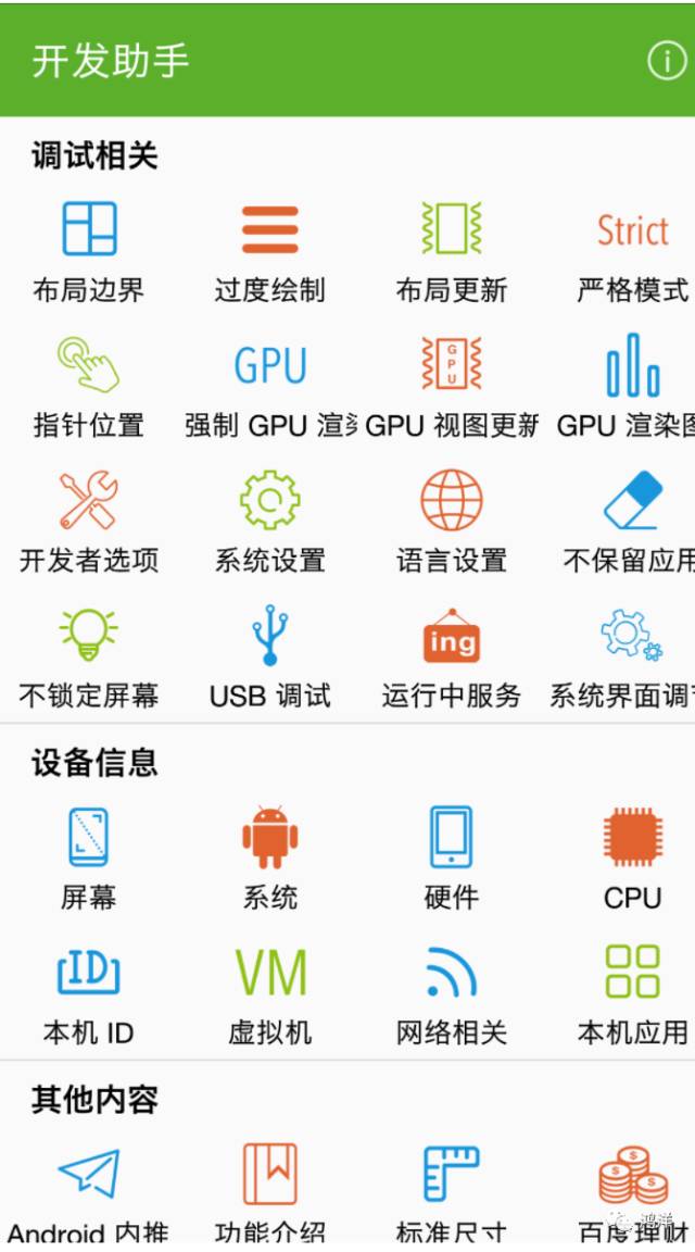 https://github.com/nisrulz/easydeviceinfo/(7)开发助手滴滴大神 Trinea 开发的一款快速调试及查看手机信息的应用。
